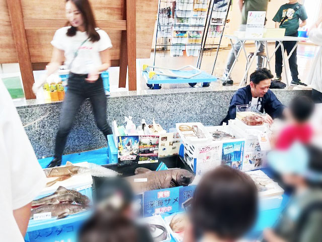 釣り竿はもちろん、釣りに役立つ小物から、キャスティング講習会、深海魚の展示、ぬりえなど様々。マリン女子は、紙の魚に磁石がついた釣りに挑戦!アトリウムの床に磁石がやんわりとくっつき、狙いを間違えるとリカバリーが難しいという、大人もしっかり遊べる釣りゲームでした。
