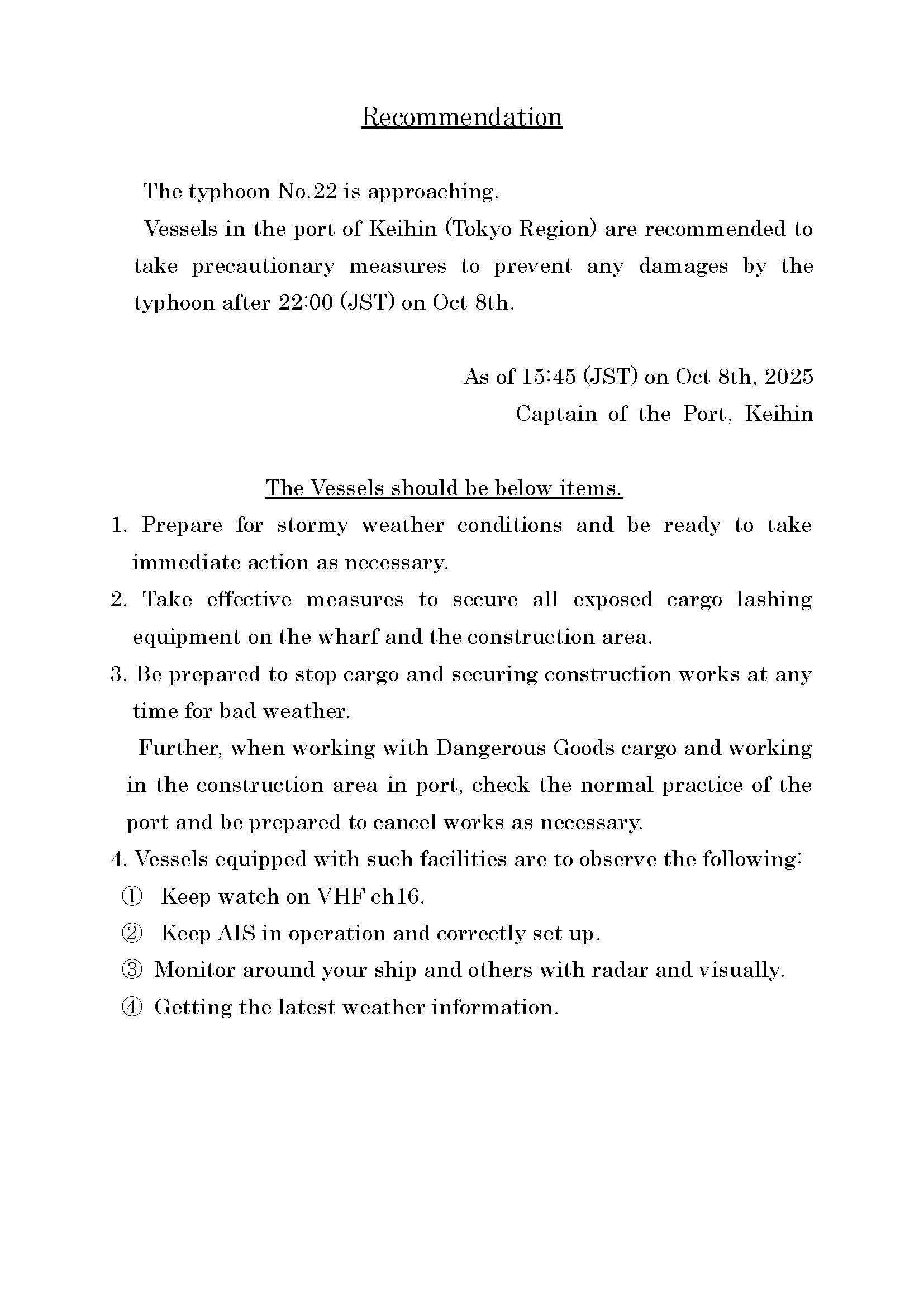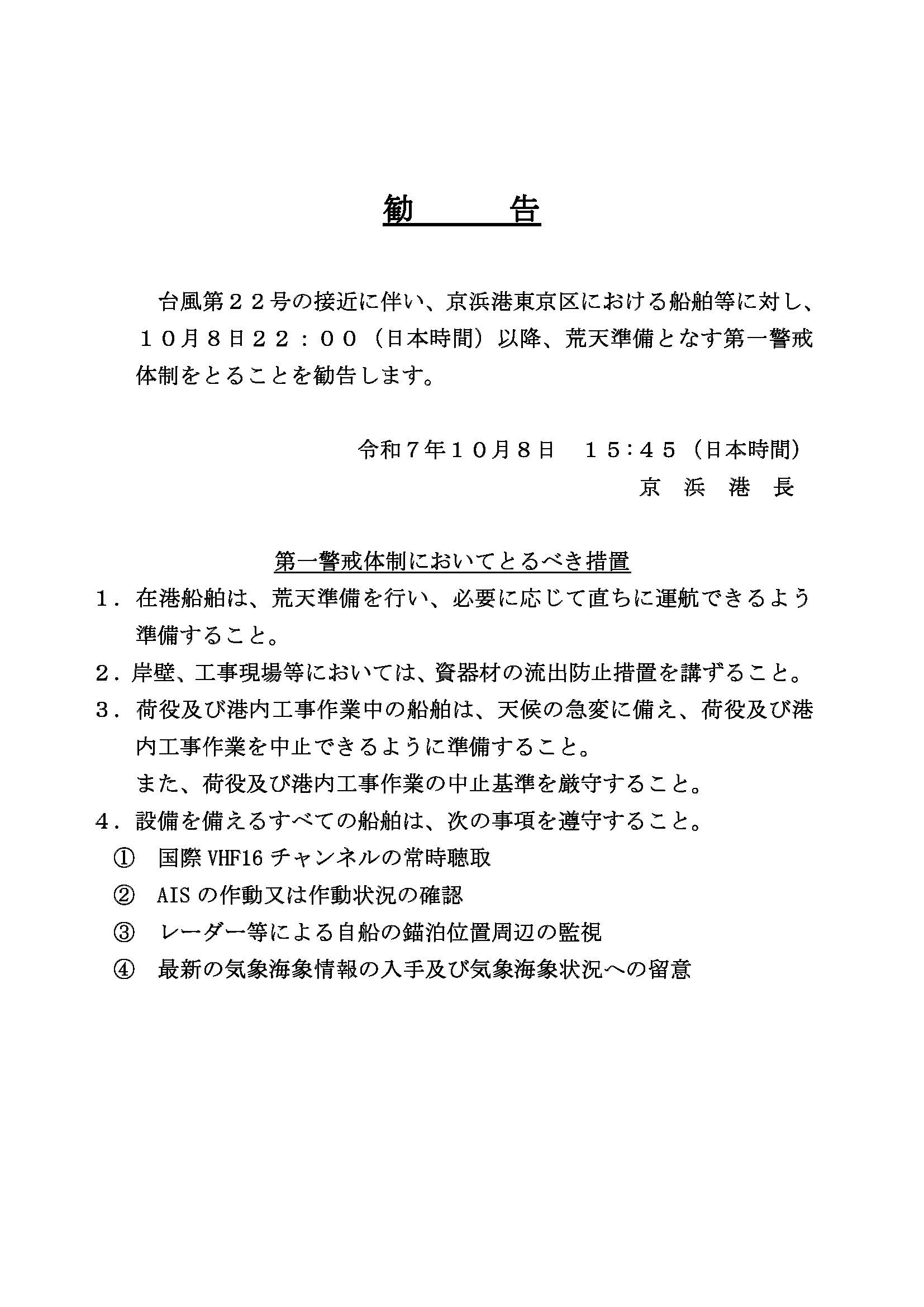 低気圧の接近に伴い、京浜港東京区における船舶等に対し、10月8日22:00(日本時間)以降、荒天準備となす第一警戒体制をとることを勧告します。