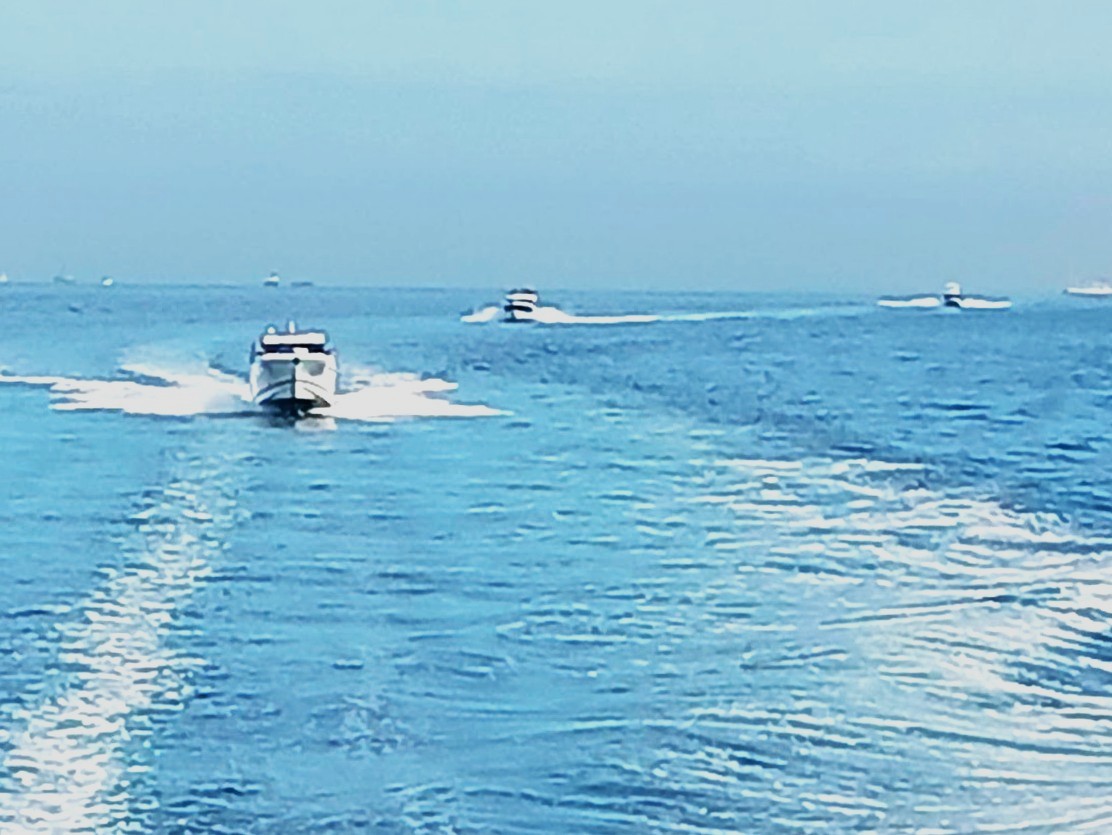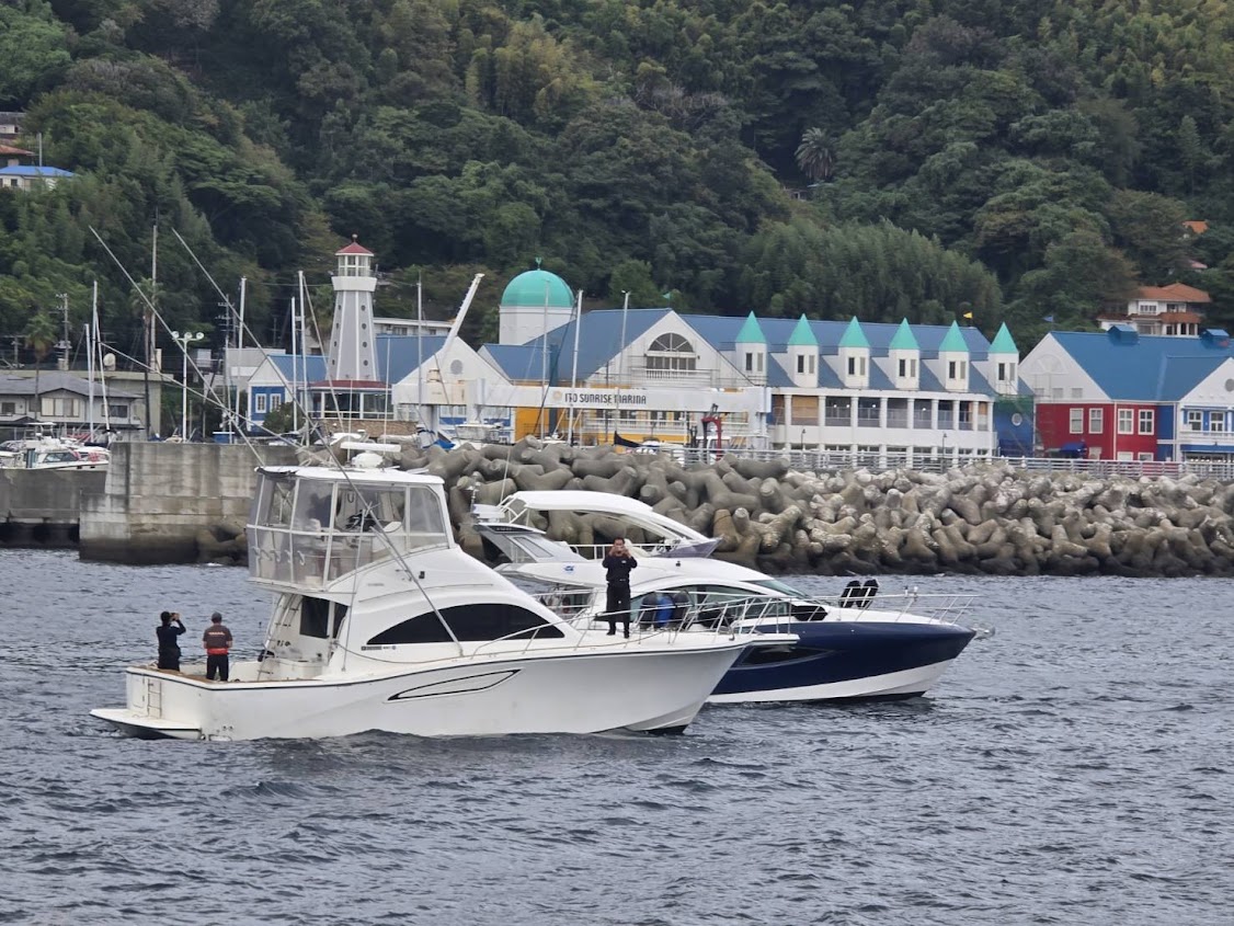 朝のマリーナには出港前のワクワクとドキドキした雰囲気がいっぱい。船団がそろって海へ滑り出す光景が印象的でした。海況は午後から南風が強まる予報。昼までには伊東サンライスマリーナに入港したいと思い、予定より1時間早く集合し、出港。参加艇の皆様にご協力いただき、およそ23ノットで3.5時間、初島沖に到着。2艇のボートは初島寄港。東京湾・相模湾共に凪のうちに伊東サンライズマリーナへ入港できました。皆様、ご協力ありがとうございました。
