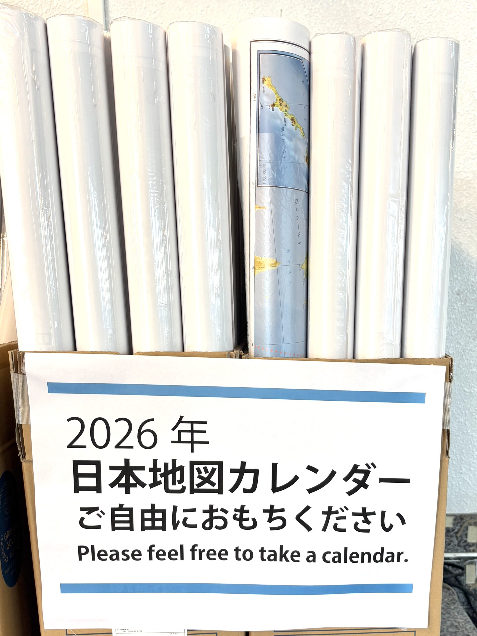毎年恒例となりました、2026年の日本地図カレンダーの寄付をいただきました。アトリウムにて無料配布しております。無くなり次第終了となりますので、ご入用の方はお早めにお越しください。なお、取り置きは行っておりません。予めご了承ください。
