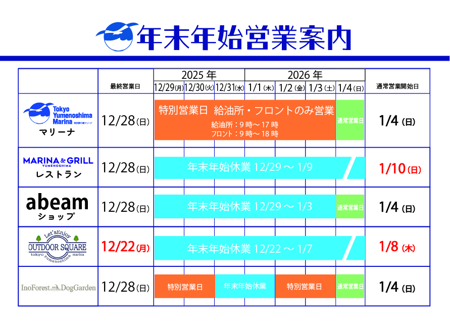 年末年始営業のおしらせ 2025年11月22日 お知らせ 特別営業日は給油所、フロントのみ営業となります。クレーンの上下架はできませんのでご了承ください。 また、桟橋のビジター艇・ジェットの受付、レンタルボートの受付も行っておりません。 PDF