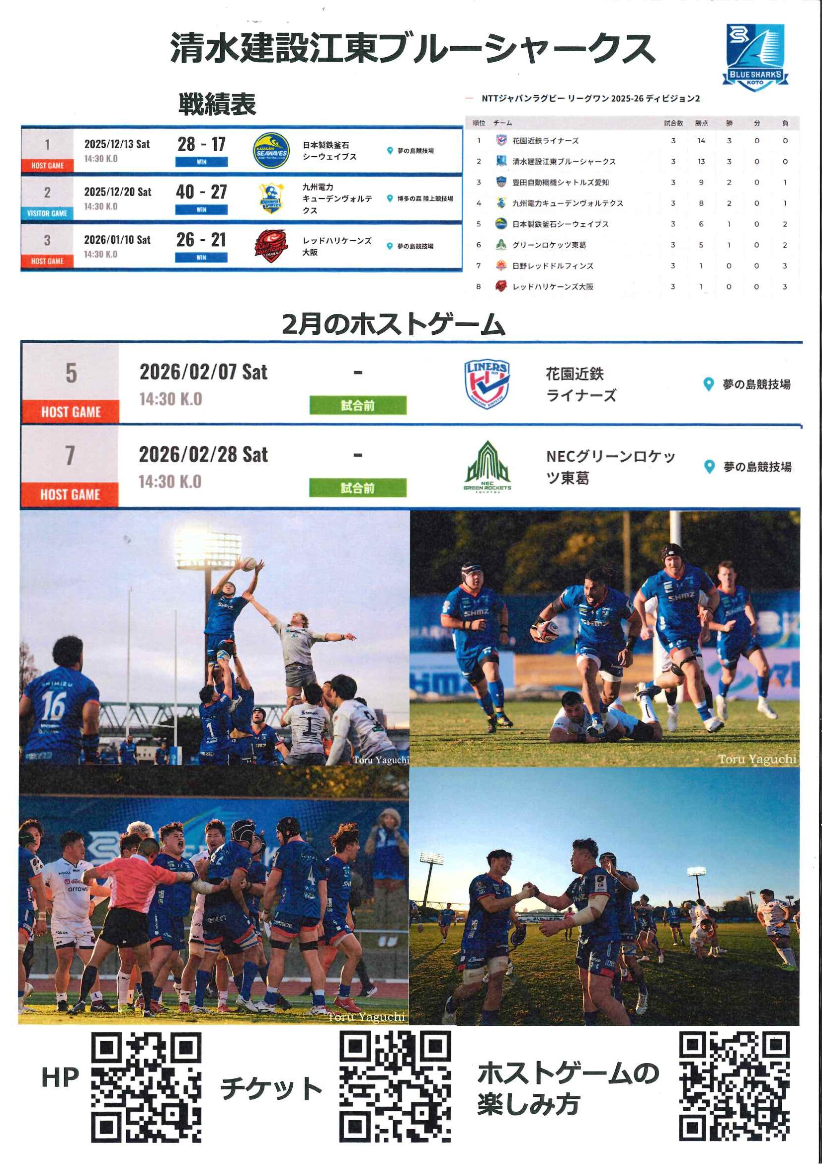 近隣イベント)ラグビーマッチ 清水建設江東ブルーシャークス 2026年01月14日 マリンライフ 夢の島 , ラグビー , 競技場 ラグビーに興味のある方!ぜひ応援にきてください。江東区をホームグラウンドとするラグビーチームです。ホストゲームは2/7 2/28 夢の島競技場で予定されています。 詳しくはこちらのHPをごらんください。