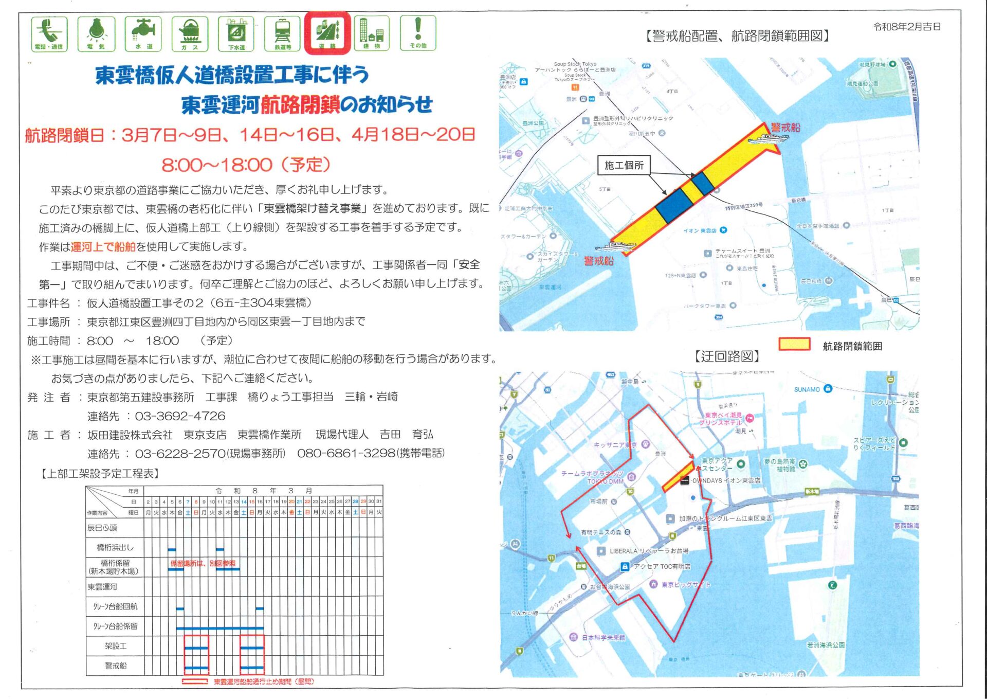 東雲橋老朽化に伴い東雲橋架け替え事業が進んでいます。仮人道橋上部工(上り線側)の架設工事に着工予定です。運河上で船舶を使用して行いますので、航路を閉鎖いたします。通行できませんのでご注意ください。