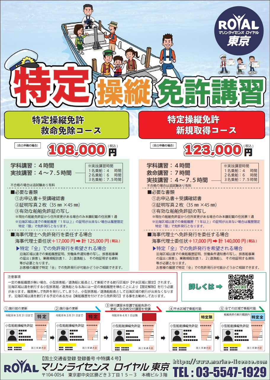 2024年4月1日以降に人の運送(旅客船や遊漁船など)を行う目的で、小型船舶を船長として操縦する場合は、1級小型船舶免許または2級小型船舶免許の他に、新しい制度による「特定操縦免許」が必要となり、特定操縦免許を取得する為には、特定操縦免許講習の受講が必要です。
