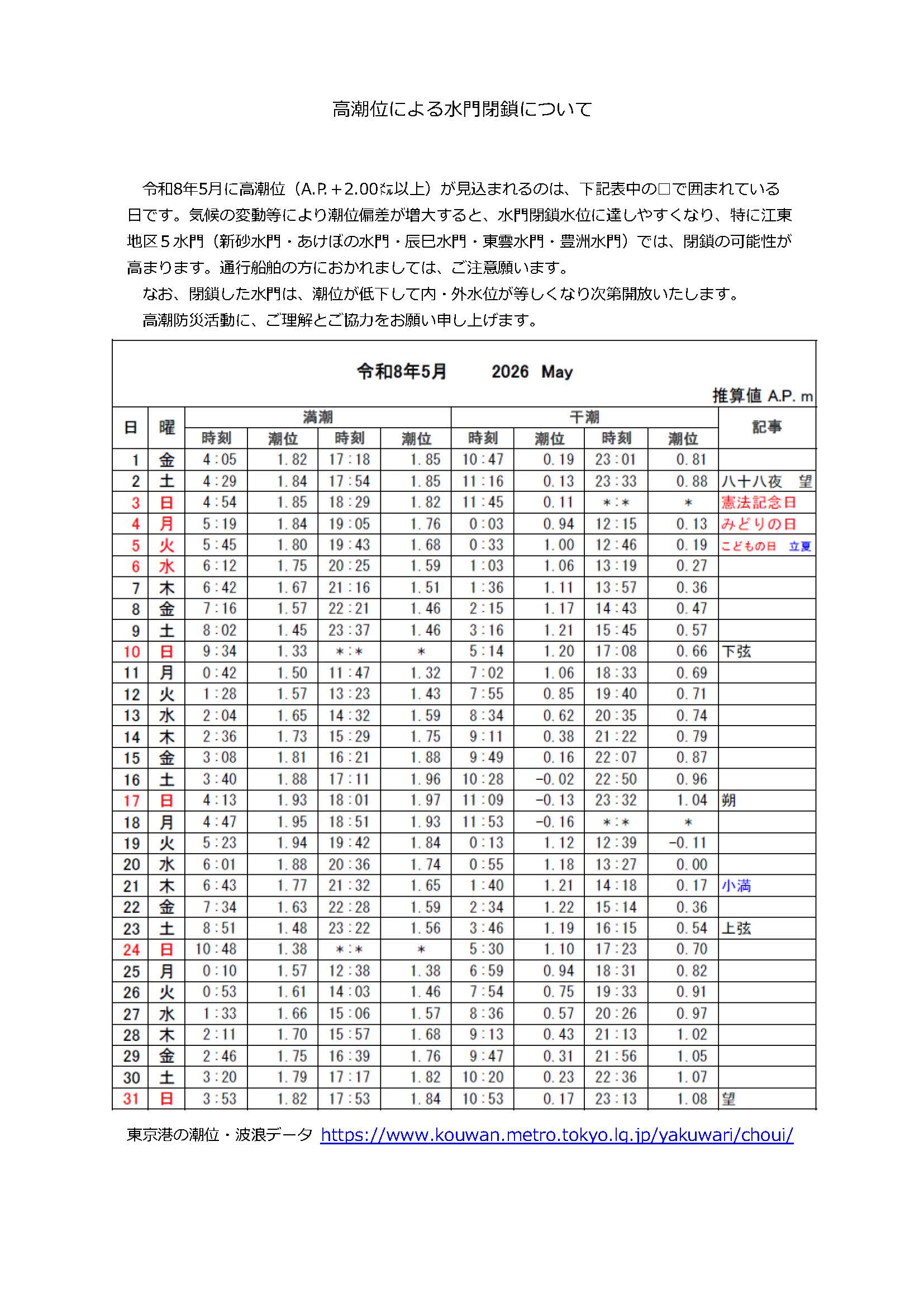 地区5水門(新砂水門・あけぼの水門・辰巳水門・東雲水門・豊洲水門)では、閉鎖の可能性が